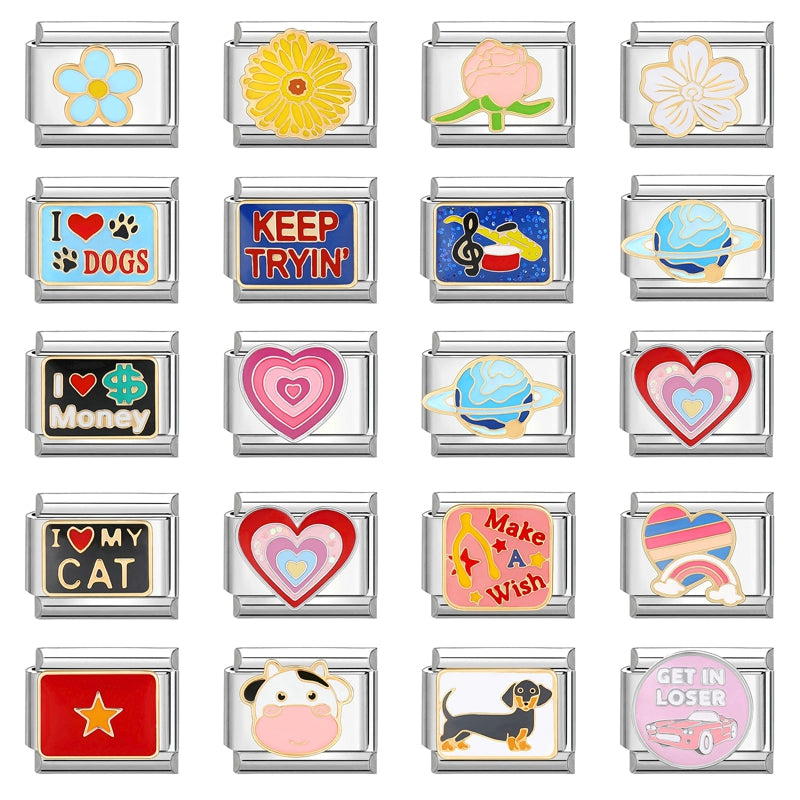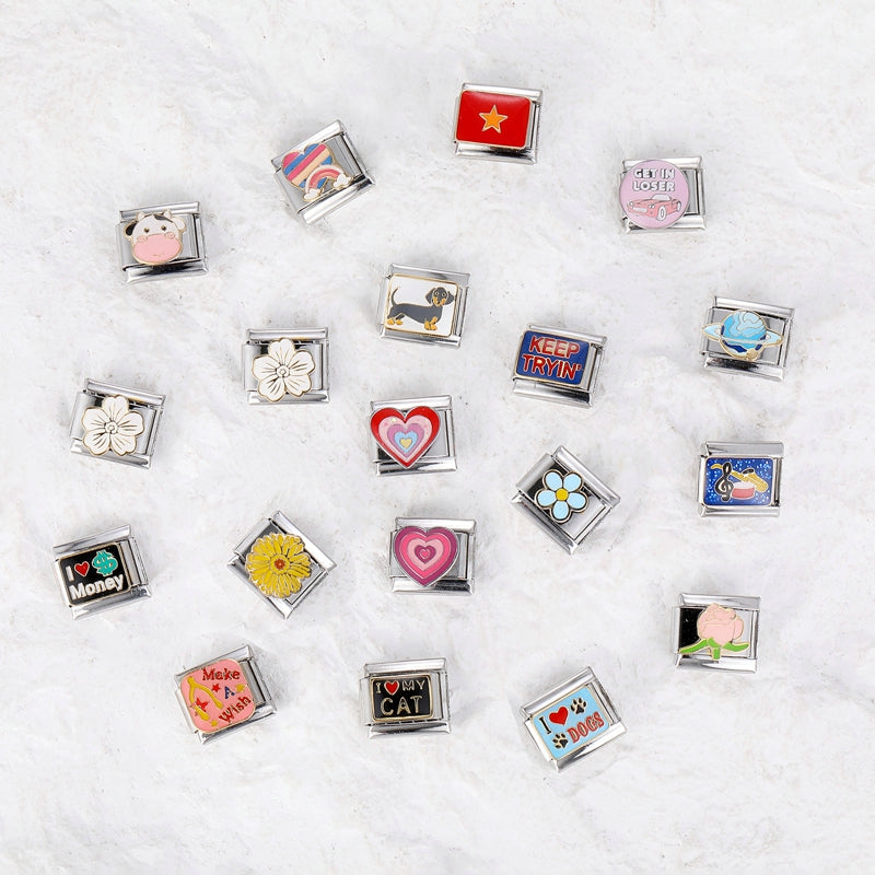 Celebre el amor, la naturaleza y la personalidad con este vibrante conjunto de encanto diseñado para pulseras de eslabones italianos de 9 mm. Con símbolos divertidos como corazones, margaritas, perros, vacas, estrellas y planetas, cada amuleto de acero inoxidable agrega un toque único a sus creaciones de joyería DIY. Perfecto para mujeres que aman expresarse a través de la moda. • 💕 Motivos incluidos: AMOR, corazón, flor, margarita, perro, vaca, estrella, planeta • 🧩 Compatibilidad: Se adapta a todas las pulseras de dijes italianas estándar de 9 mm • 💎 Material: Acero inoxidable de primera calidad — duradero, brillante e hipoalergénico • 👩 Género: Diseñado para mujeres amantes de los accesorios modernos y expresivos • 🎨 Estilo: Audaz y divertido — perfecto para hacer bricolaje, regalar o coleccionar • 🎁 Ocasiones: Ideal para cumpleaños, regalos de amistad o para construir tu propia historia de encanto Mezcla, combina y hazlo tuyo — cada encanto cuenta una parte de tu historia.